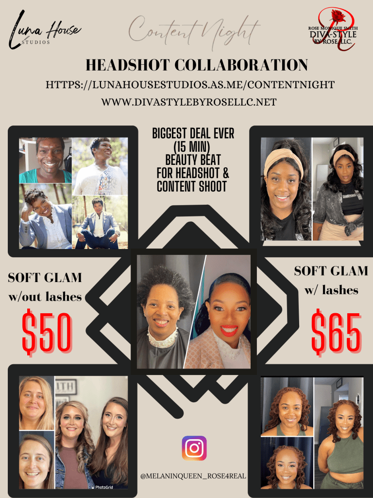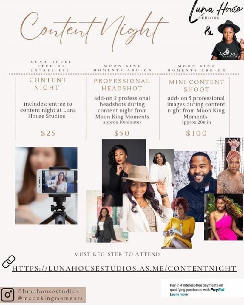 CONTENT NIGHT Tuesday March, 21st 6:30pm-9:30pm. Click below to book your glam session